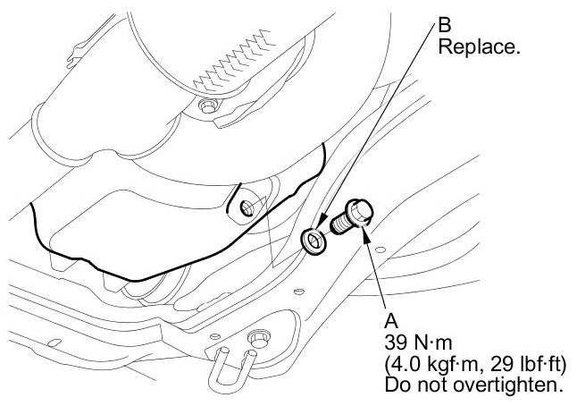 3. Reinstall the drain bolt with a new washer (B) and torque to specification.