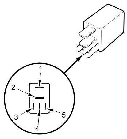 - There should be continuity between terminals No. 1 and No. 2 when battery power is connected to terminal No. 5, and body ground is connected to terminal No. 3.