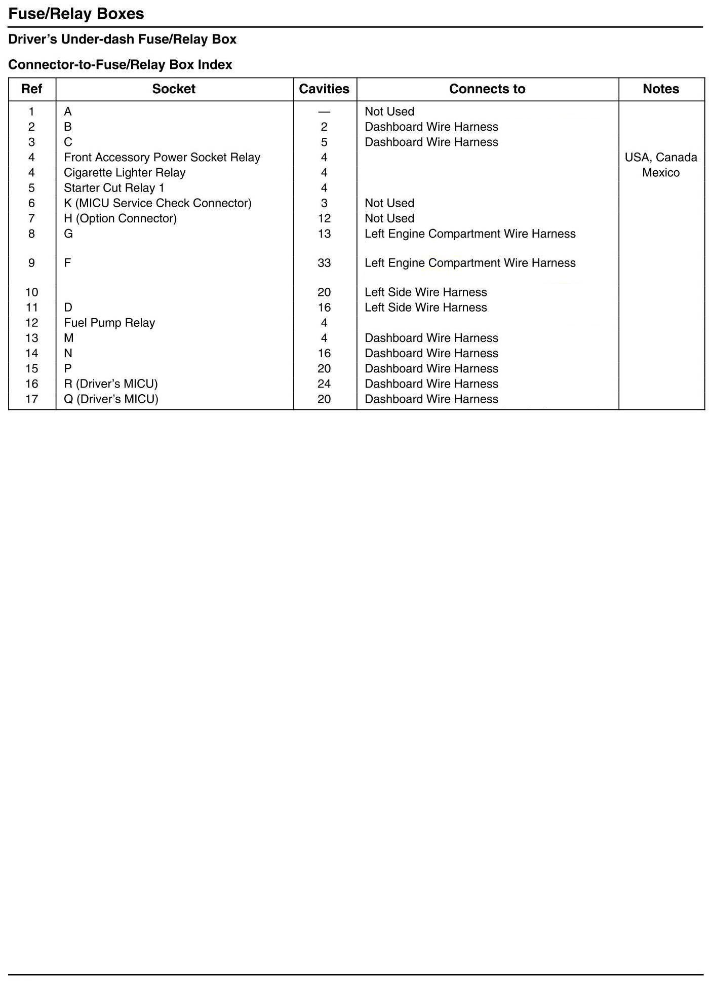 Driver's Under-dash Fuse/Relay Box - Connector-to-Fuse/Relay Box Index
