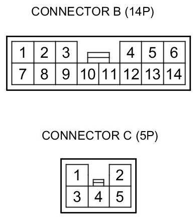 There should be battery voltage at terminal B5 when battery power is connected to terminals C2 and B12, and battery ground is connected to terminals B4,B13, and B14. There should be no voltage at terminal B5 when terminal B14 is disconnected.
