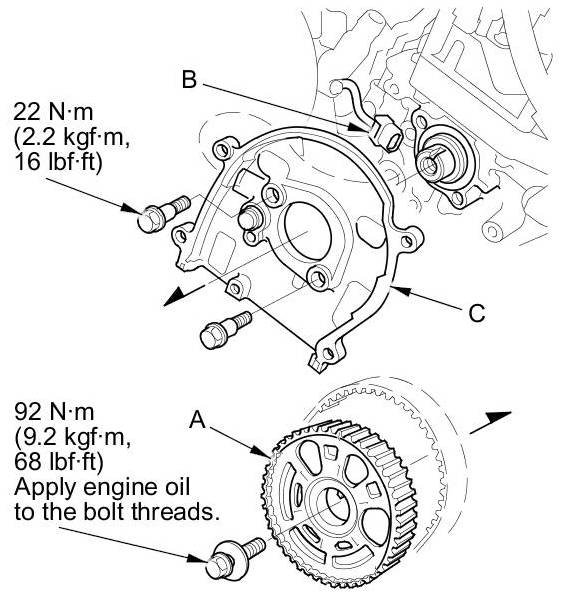3. Disconnect the CMP sensor connector (B), then remove the back cover (C).