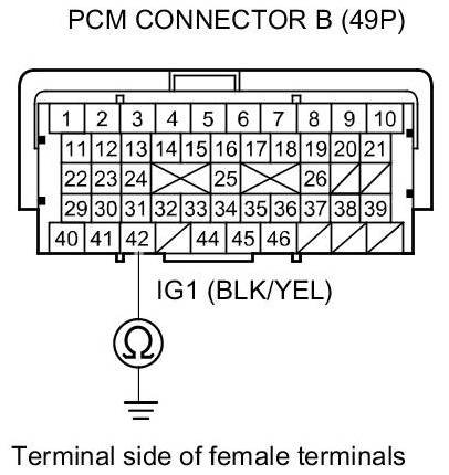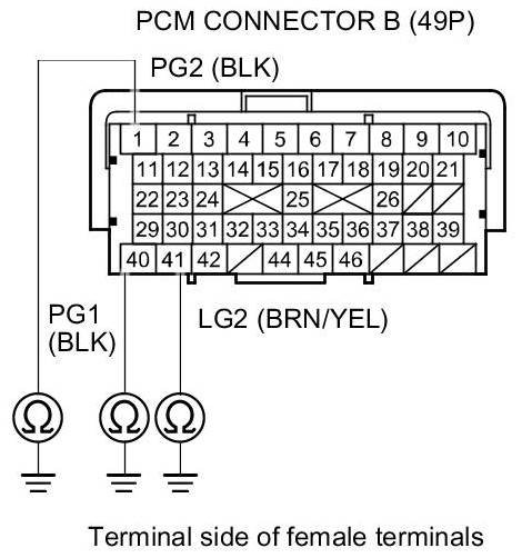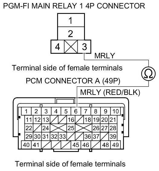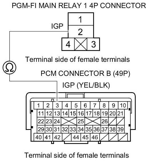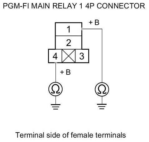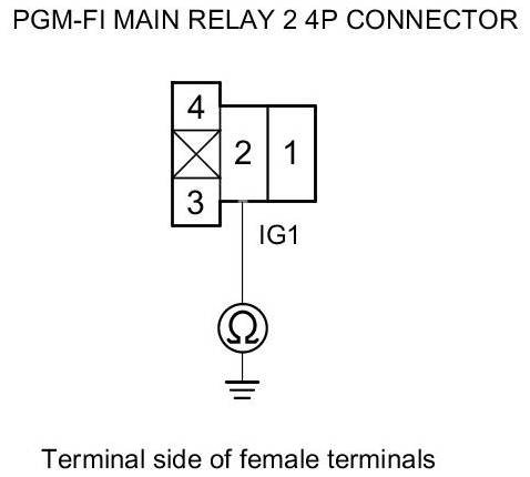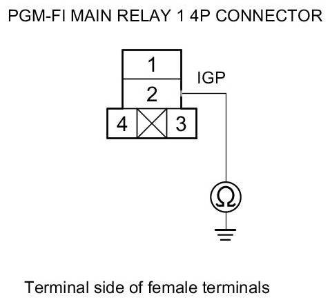 40. Check for continuity between body ground and PGM-FI main relay 1 4P connector terminals No. 1 and No. 4 individually.
