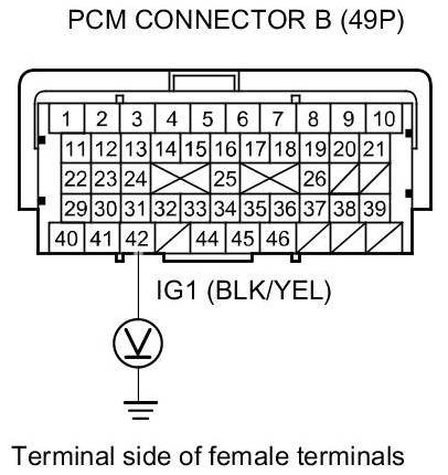 59. Measure the voltage between PCM connector terminal B42 and body ground.
