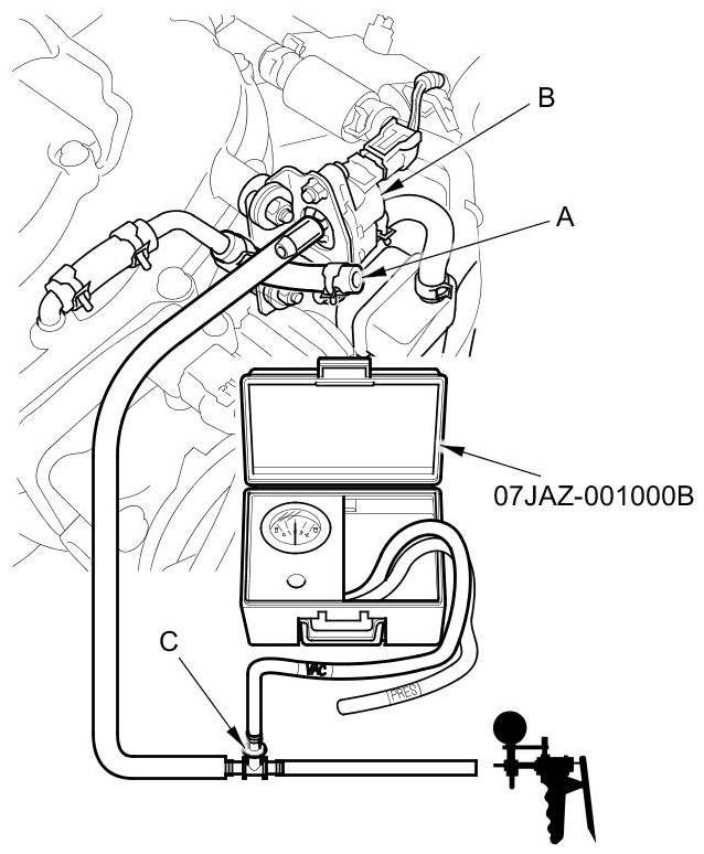 8. Disconnect the vacuum hose (A) from the EVAP canister purge valve (B) in the engine compartment, then connect a T-fitting (C), a vacuum gauge, and a vacuum pump/gauge, 0-30 inHg, to the EVAP canister purge valve as shown.