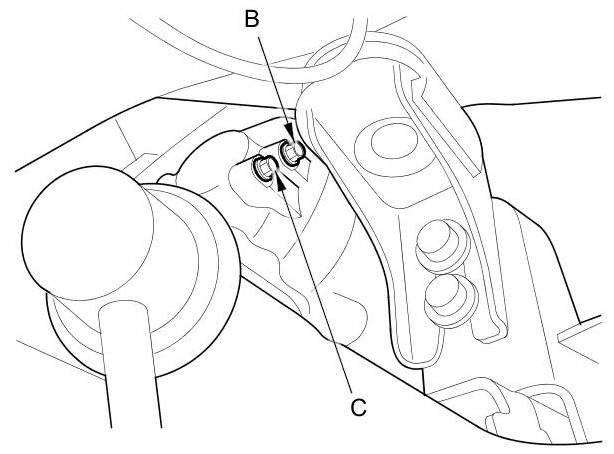 11. Connect the A/T oil pressure gauge to the 1st clutch pressure inspection port (B) and the 1st-hold clutch pressure inspection port (C).