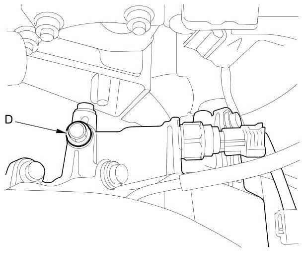 12. Remove the air cleaner housing Service and Repair, and connect the A/T oil pressure gauge to the 2nd clutch pressure inspection port (D), then temporarily install the air cleaner housing.