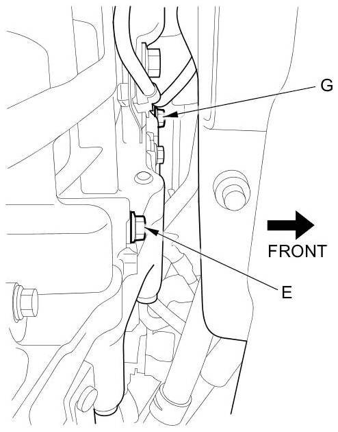 19. Connect the A/T oil pressure gauge to the 3rd clutch pressure inspection port (E) and the 5th clutch pressure inspection port (G).