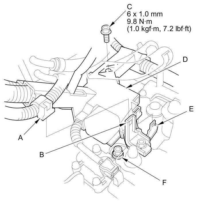 22. Connect the A/T oil pressure gauge to the 4th clutch pressure inspection port (F) then temporarily install the air cleaner housing.