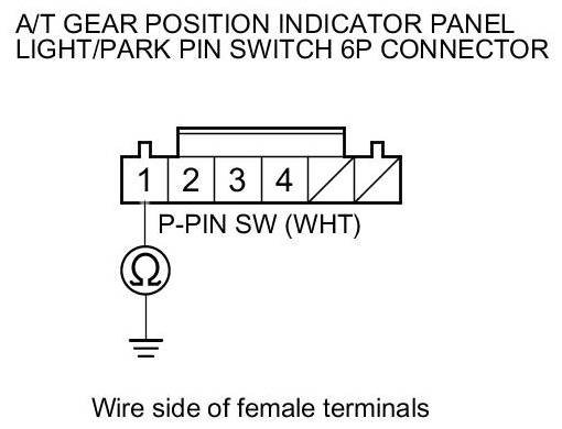 16. Check for continuity between A/T gear position indicator panel light/park pin switch 6P connector terminal No. 1 and body ground.