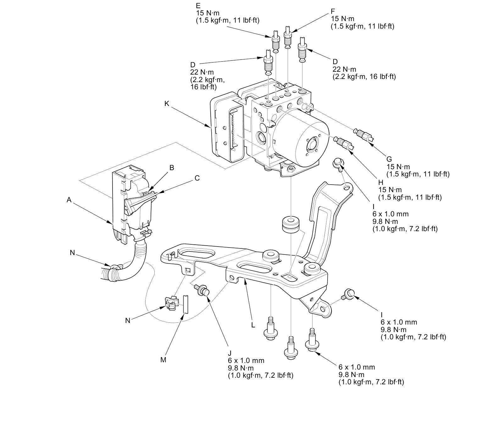 7. Remove the 6 x 12 mm flange bolts (I) and 6 x 16 mm flange bolt (J), then remove the VSA modulator-control unit (K) with the bracket (L) from the body.