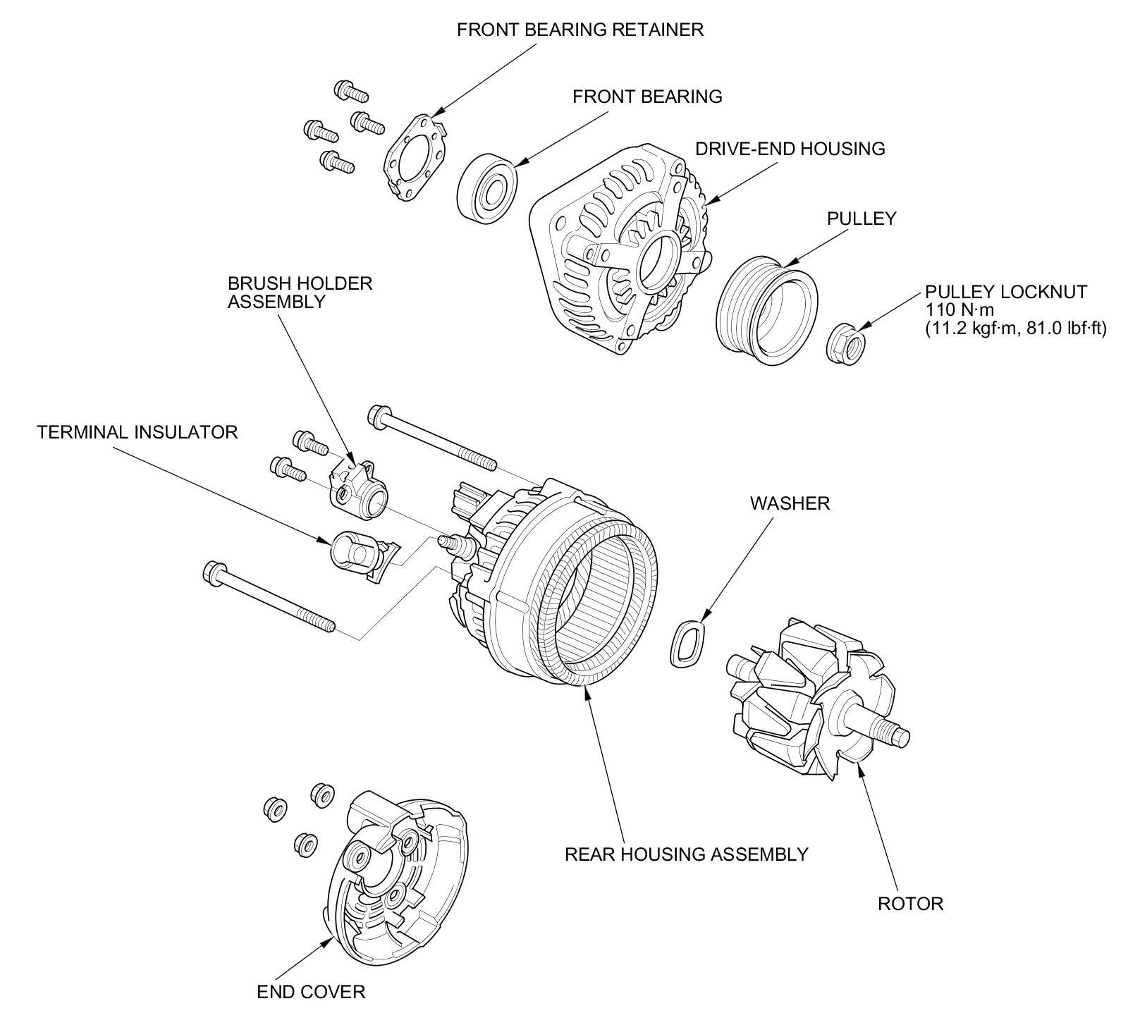 16. If you removed the pulley, put the rotor in the drive-end housing, then torque its locknut to 110 Nm (11.2 kg-m, 81.0 lb-ft).