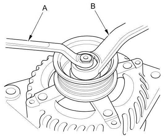 3. If the front bearing needs replacing, remove the pulley locknut with a 10 mm wrench (A) and a 22 mm wrench (B). If necessary, use an impact wrench.