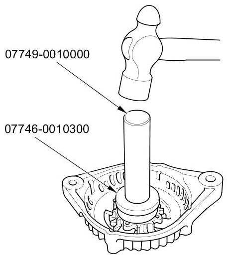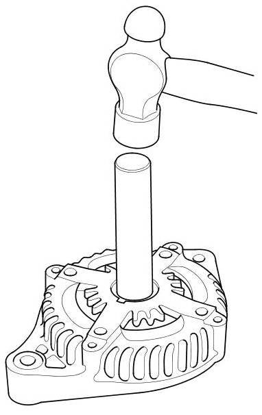 12. Install a new front bearing in the drive-end housing with a hammer, the driver handle, 15 x 135L, and the bearing driver attachment, 42 x 47 mm.
