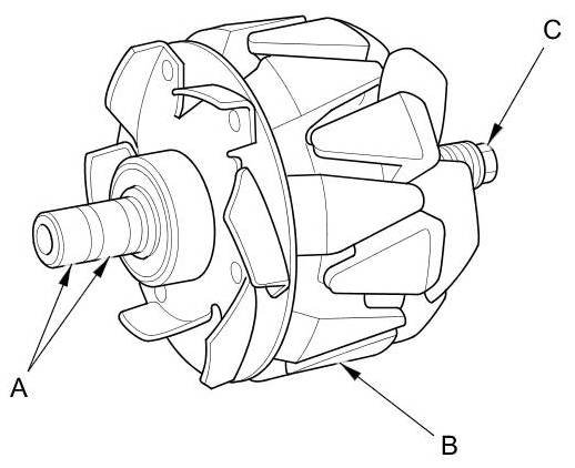 15. Check for continuity between each slip ring and the rotor (B) and the rotor shaft (C):
