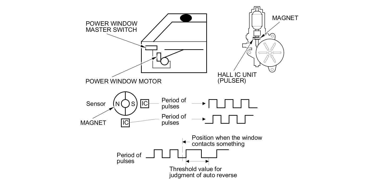 The driver's and front passenger's power window motors incorporate a Hall IC unit (pulser) which generates pulses during the motor's operation and sends pulses to the driver's and passenger's power window control units. As soon as the power window control units detect a change in the pulse frequency from the Hall IC unit (pulser), the power window control units make the power window motor stop and reverse. This prevents pinching your hand or fingers during auto-up operation. The auto reverse function does not work when the power window master switch is held in the closed position.