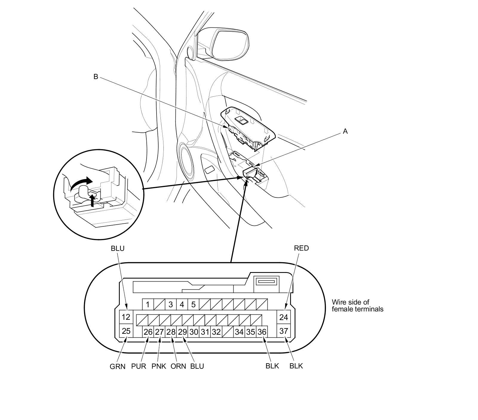 3. Disconnect the 37P connector (A) from the front passenger's power window switch (B).