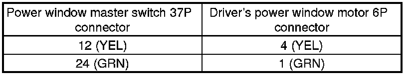 2. Test the driver's power window motor in each direction by connecting battery power and ground to the power window master switch 37P connector (A) according to the table.