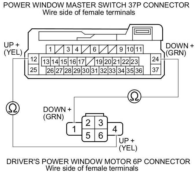 6. Check for continuity between power window master switch 37P connector terminals No. 12 and No. 24, and driver's power window motor 6P connector terminals No. 4 and No. 1 respectively. There should be continuity.