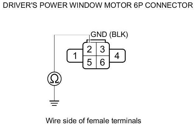8. Check for continuity between driver's power window motor 6P connector terminal No. 2 and body ground. There should be continuity.