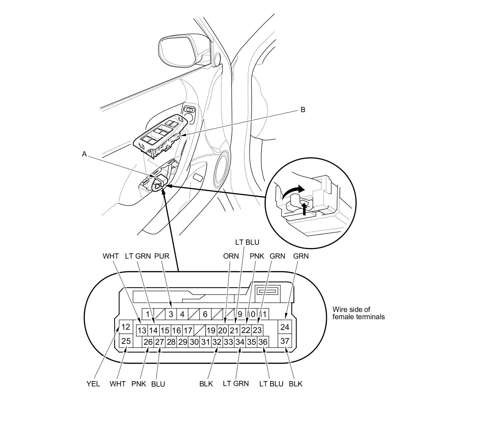 3. Disconnect the 37P connector (A) from the power window master switch (B).