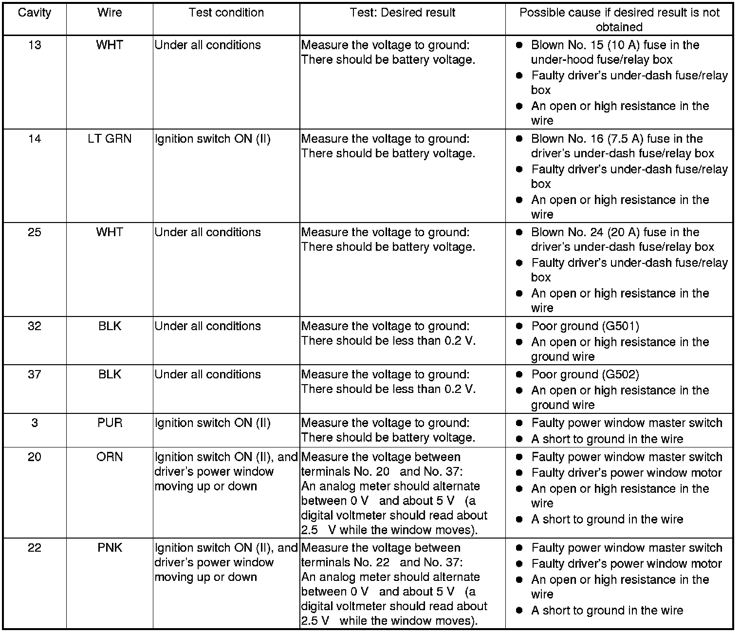 - If all the input tests prove OK, the door multiplex control unit must be faulty, replace the power window master switch Power Window Master Switch Replacement.