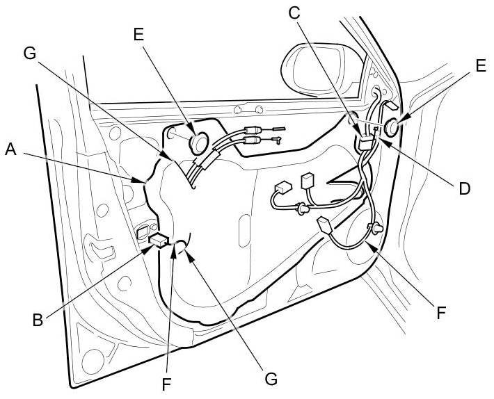 2. Disconnect the power mirror connector (C), and detach the harness clip (D).