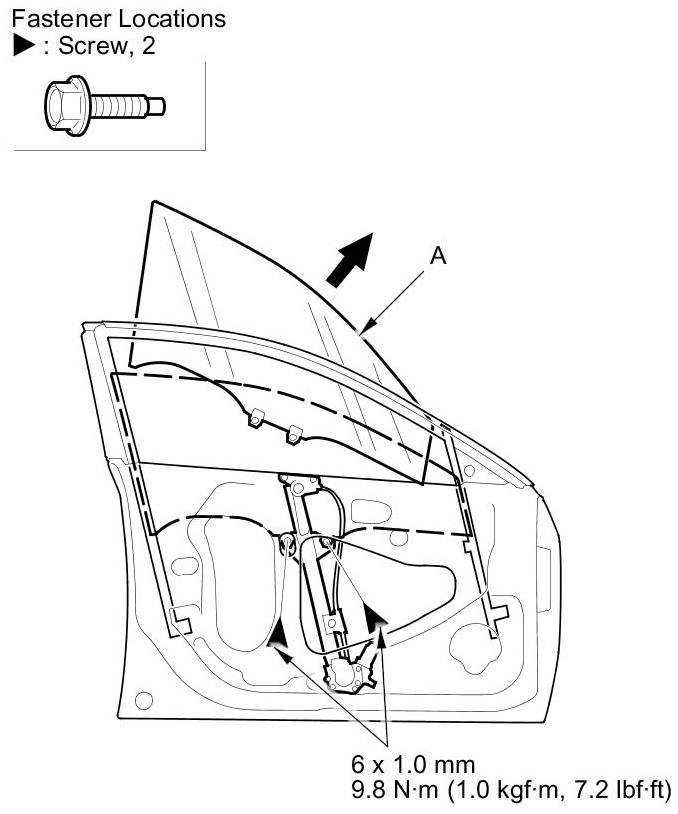 5. Carefully lower the glass (A) until you can see the bolts, then remove them. Carefully pull out the glass through the window slot.