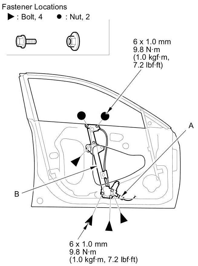 7. Remove the bolts and the nuts, then remove the regulator through the hole in the door.