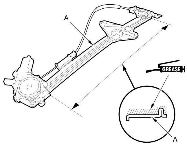 8. Apply multipurpose grease to all the sliding surfaces of the regulator (A) where shown.