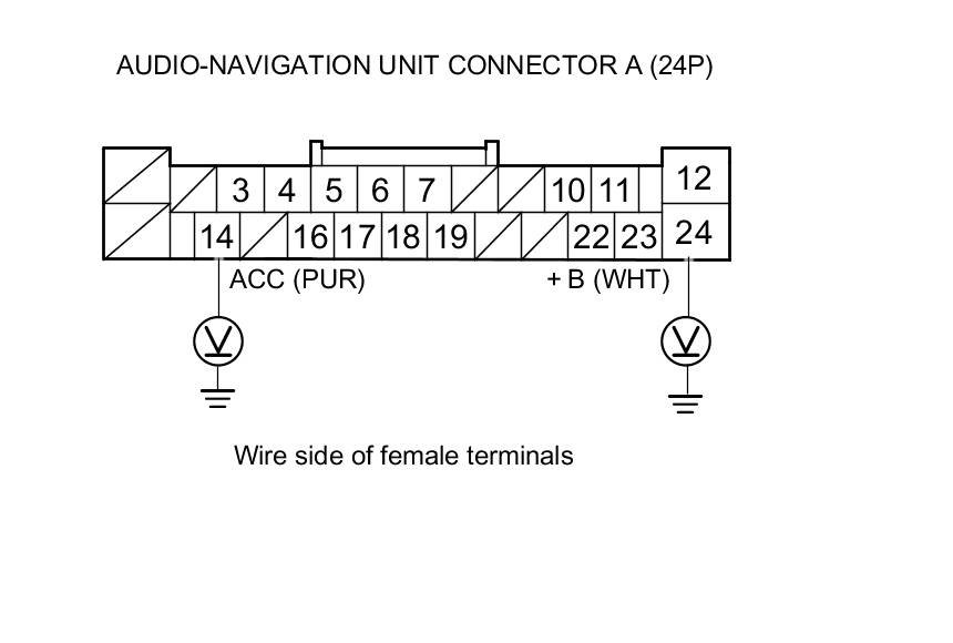 4. Measure the voltage between body ground and audio-navigation unit connector A (24P) terminals No. 14 and No. 24 individually.