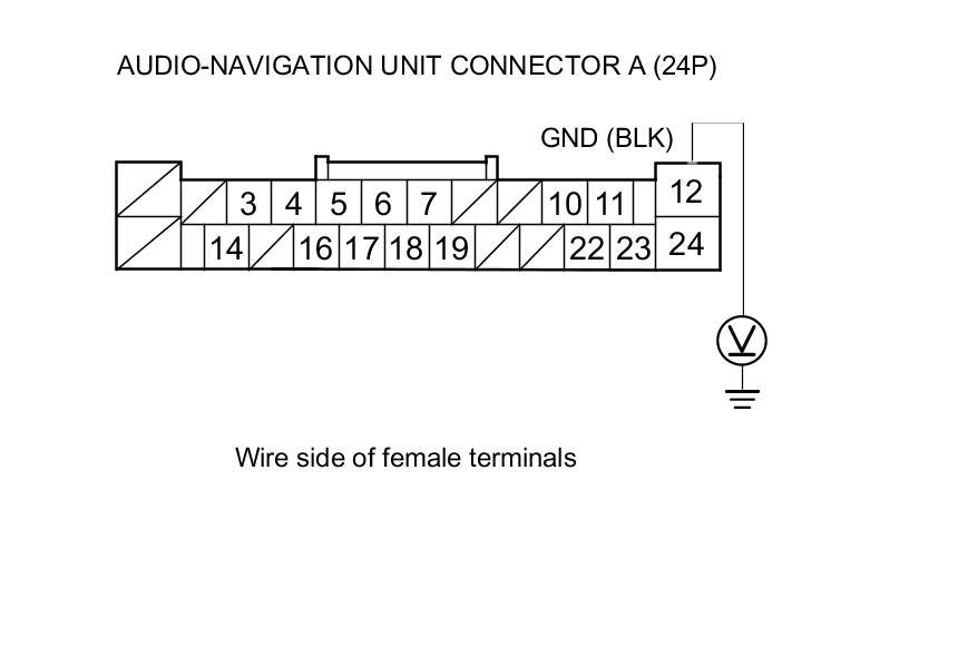 5. Measure the voltage between audio-navigation unit connector A (24P) terminal No. 12 and body ground.