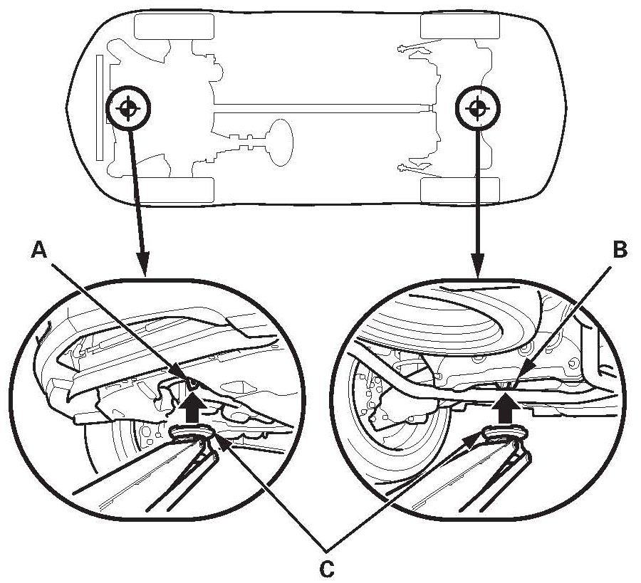 3. Position the floor jack under the front jacking bracket (A) or the rear jacking bracket (B). Center the jacking bracket on the jack lift platform (C), and jack up the vehicle high enough to fit the safety stands under it.
