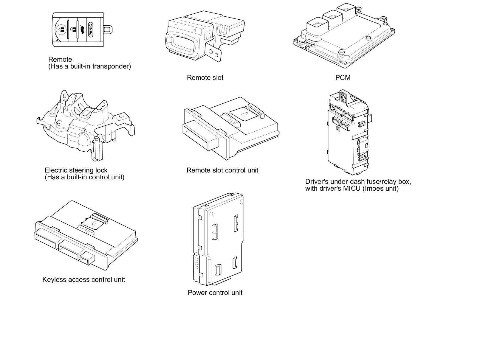This system consists of a transponder built into the remote, a remote slot control unit, the driver's MICU (has a built-in imoes unit), an immobilizer indicator, and the PCM.