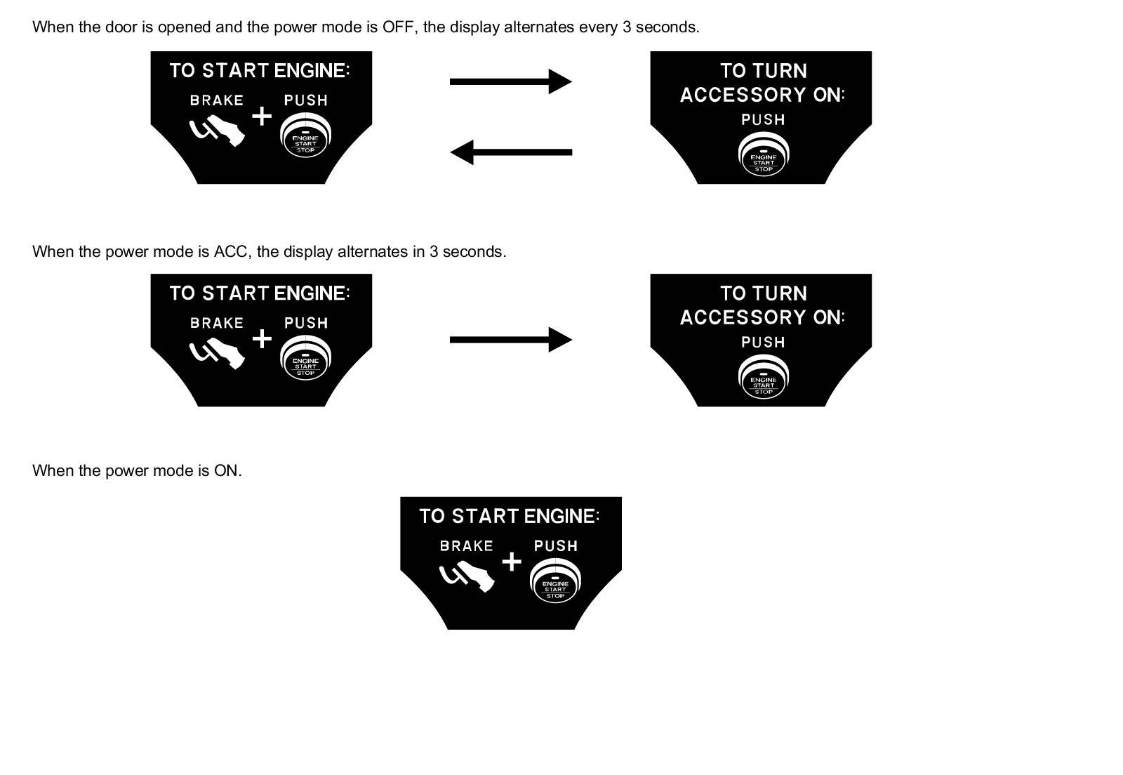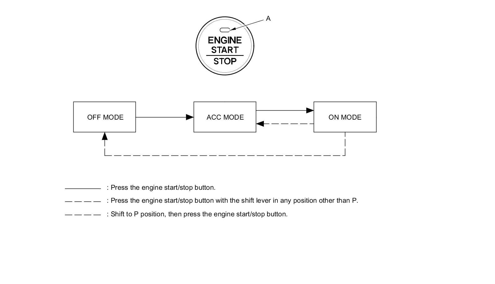The keyless access system has four power modes: OFF, ACC, ON, and START. The power modes can be changed by pressing the engine start/stop button. The power mode changes to START mode any time the engine start/stop button is pressed while also pressing the brake pedal.
