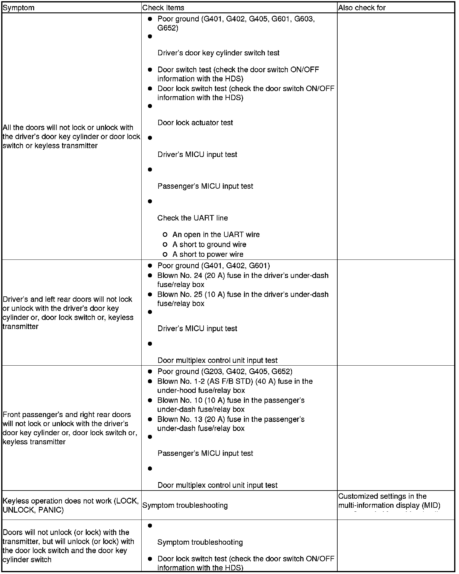 - If the door lock system and the keyless operation do not work, troubleshoot the door locks first.