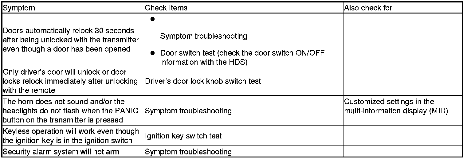 Keyless/Power Door Locks/Security System Symptom Troubleshooting Index