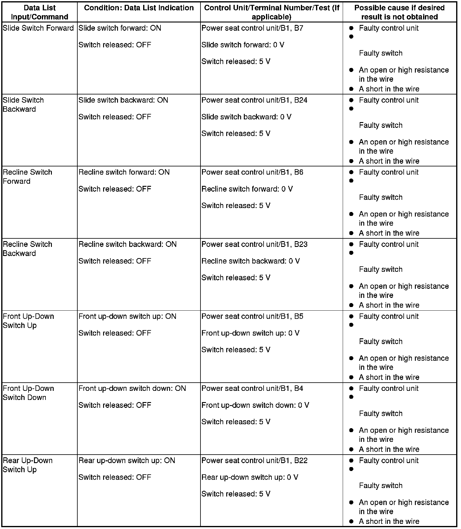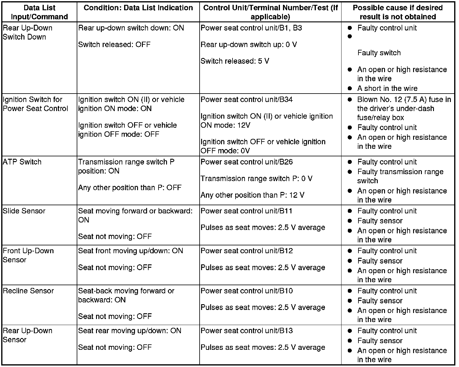 - If the data list indication is not correct, do the appropriate test at the control unit and terminal indicated in the table.