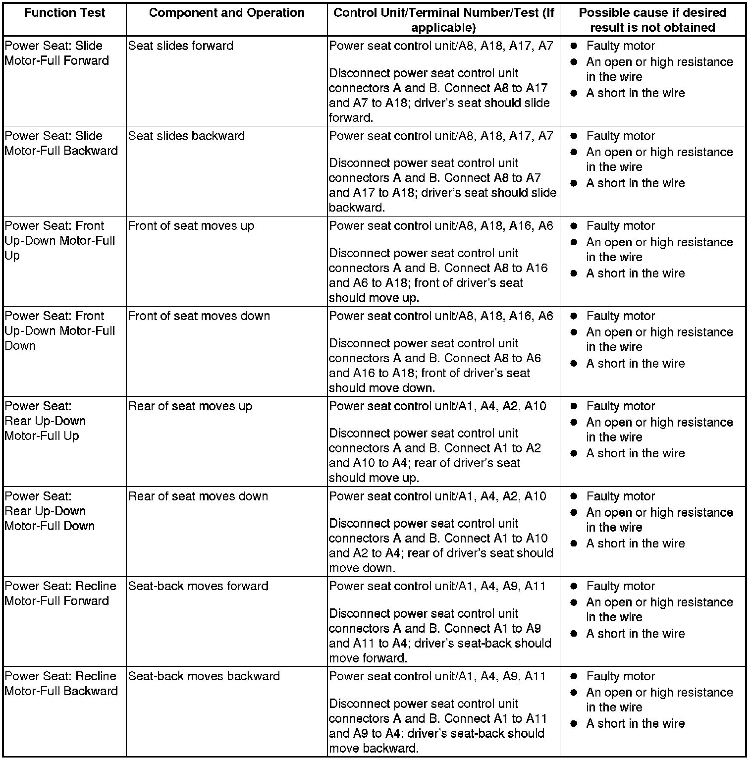 - If the function does not occur, do the appropriate test at the control unit and terminal indicated in the table.