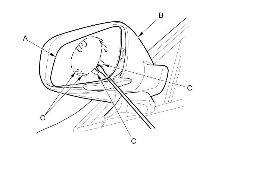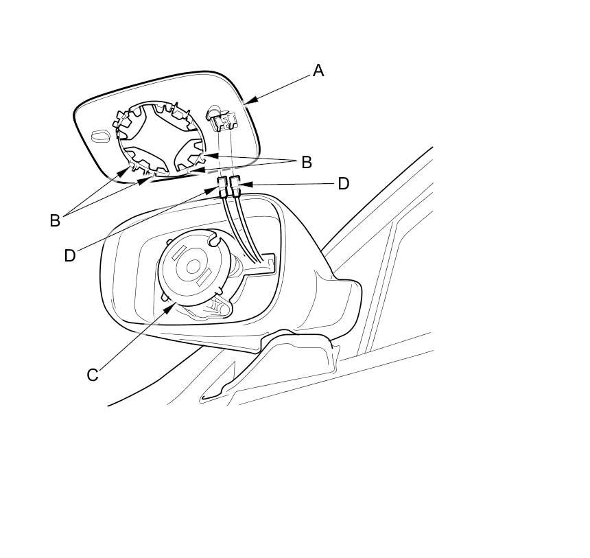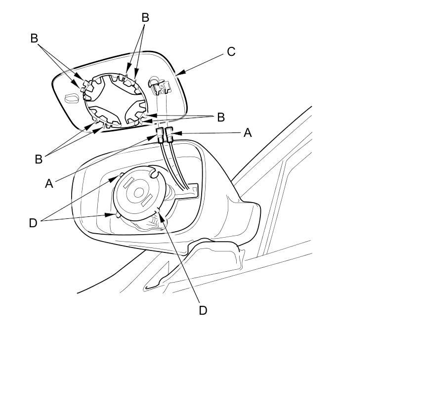 4. Separate the mirror holder from the actuator (C), and disconnect the mirror defogger connectors (D).
