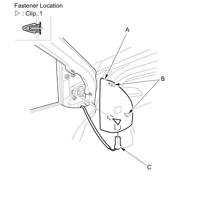 1. With your hand, carefully pull out the top edge of the door mirror cover to release the hooks (B) and detach the clip.