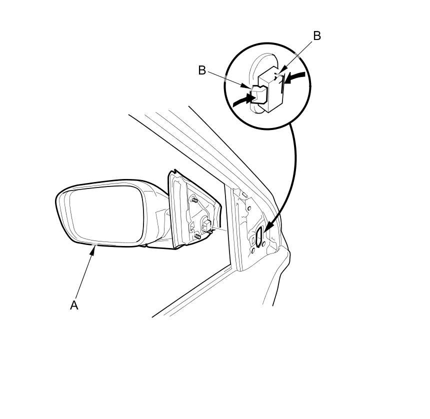 5. While holding the power mirror (A), squeeze the retaining tabs on the connector clips (B), then push out to remove the power mirror.