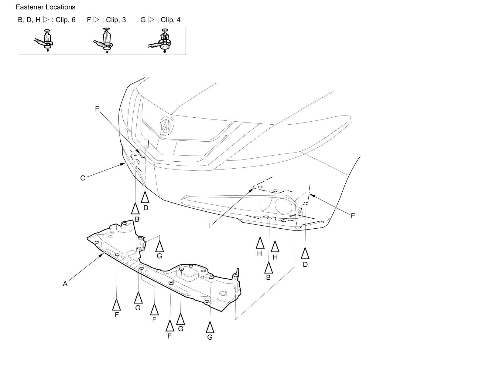 4. Detach the clips (H) securing the engine undercover (I) and the splash shield.