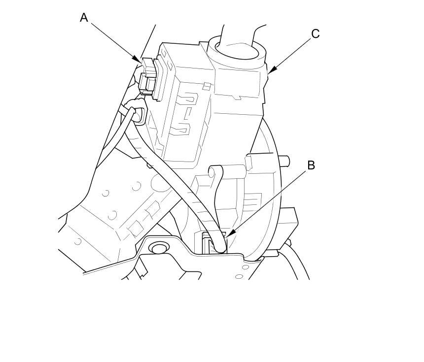 3. Disconnect the combination light switch 12P connector (A) and the steering angle sensor 5P connector (B) from the combination switch assembly/cable reel (C).