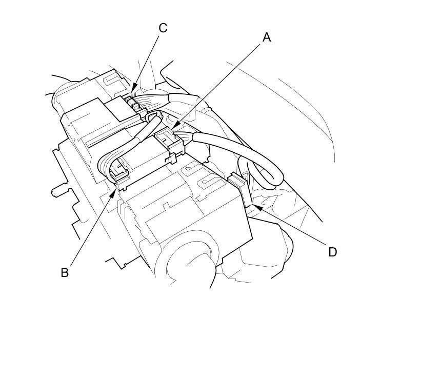 4. Disconnect the dashboard wire harness 4P connector (A) from the cable reel 4P connector (B), then disconnect the dashboard wire harness 20P connector (C) and the wiper/washer switch 8P connector (D).