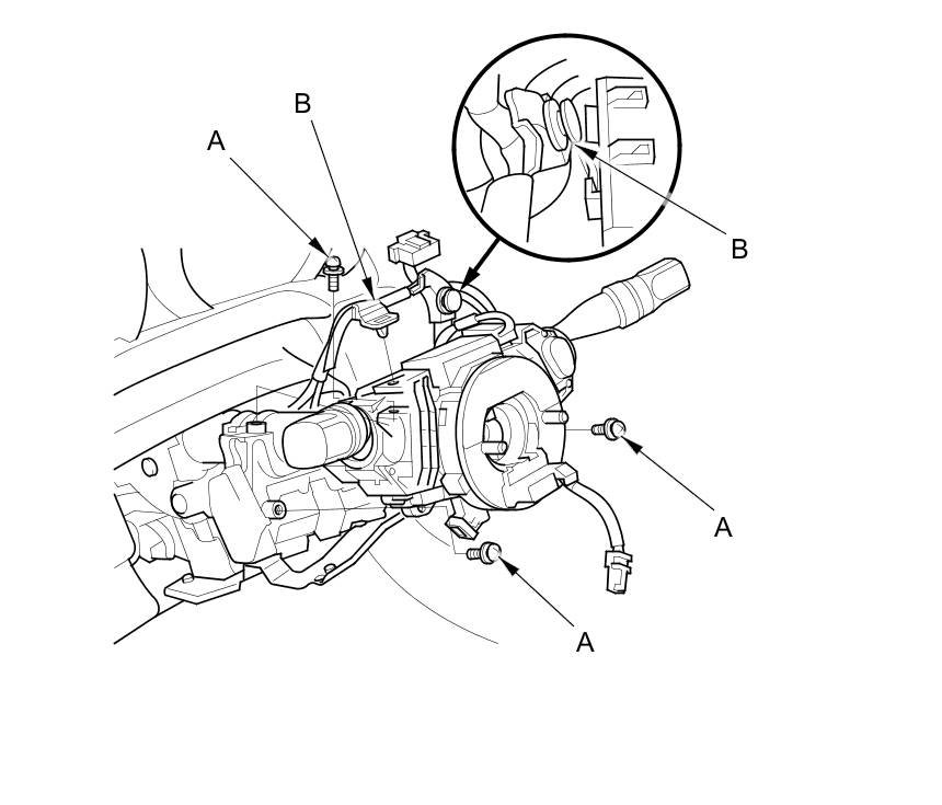 6. Remove the wire harness clips (B), then remove the combination switch assembly/cable reel from the steering column.