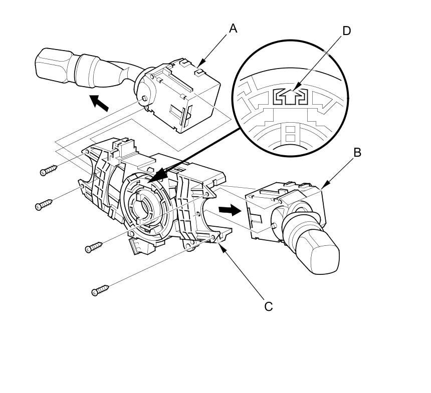 NOTE: When installing the cable reel, set the turn signal canceling sleeve position so that the arrow points (D) straight up.
