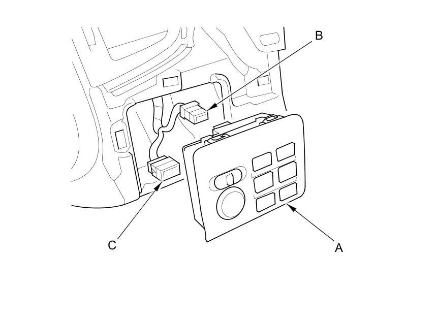 3. Remove the multi switch (built-in VSA OFF switch) (A), then disconnect the multi switch 12P connector (B) and the power mirror switch 13P connector (C).