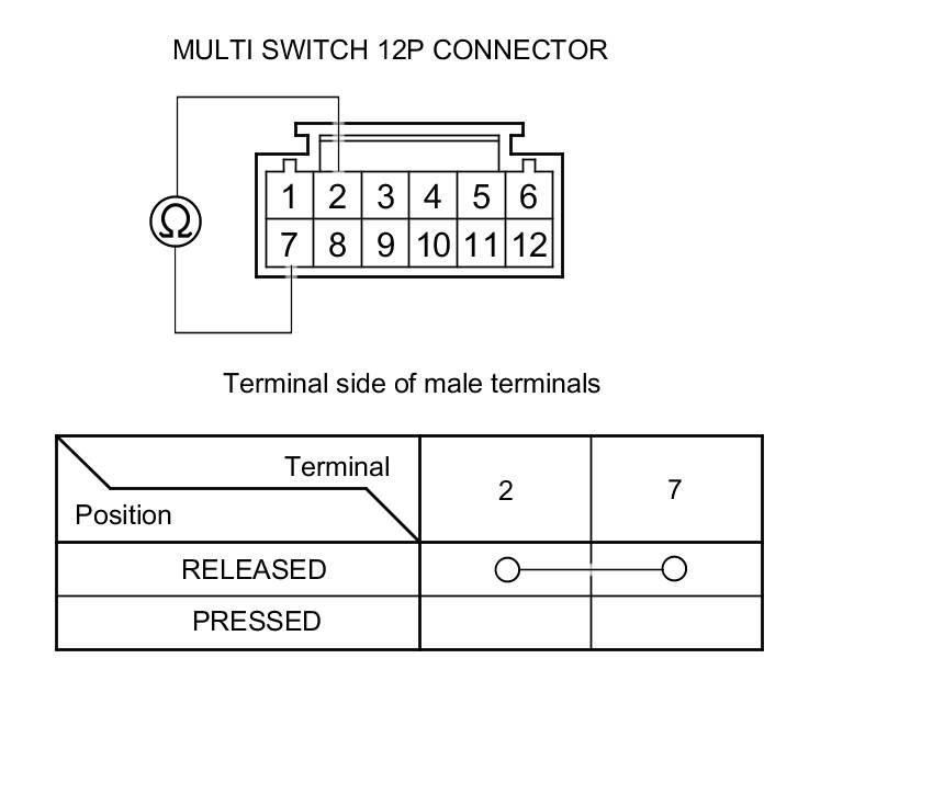 4. On the switch side, check for continuity between the multi switch 12P connector terminal in each switch position according to the table.