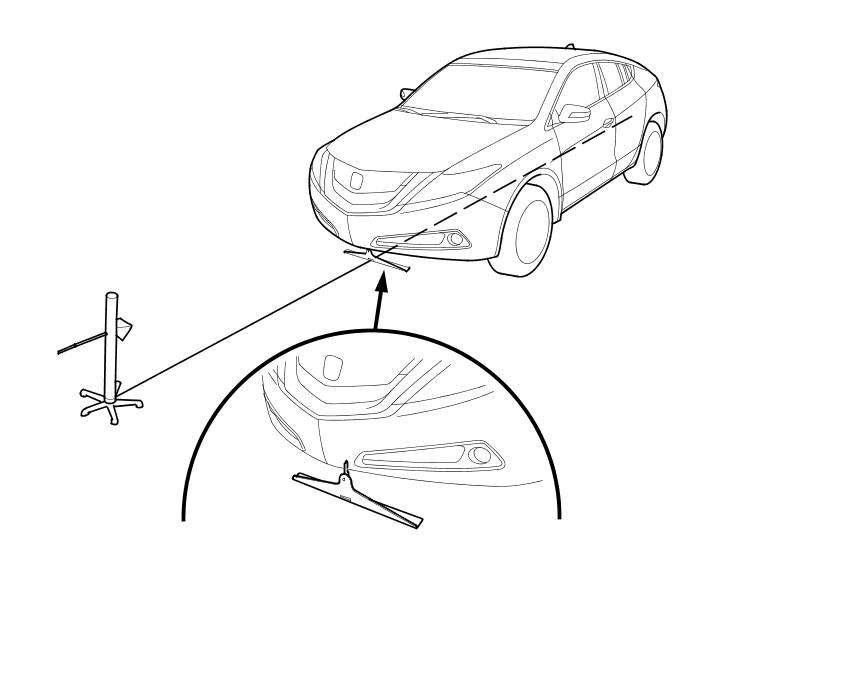 9. With the target and the height rod aligned with the cord, move the target out in front of the vehicle until the cord is fully extended 16.4 ft (5 m) from the front of the front bumper. Position the cord at the centerline of the centering stand.