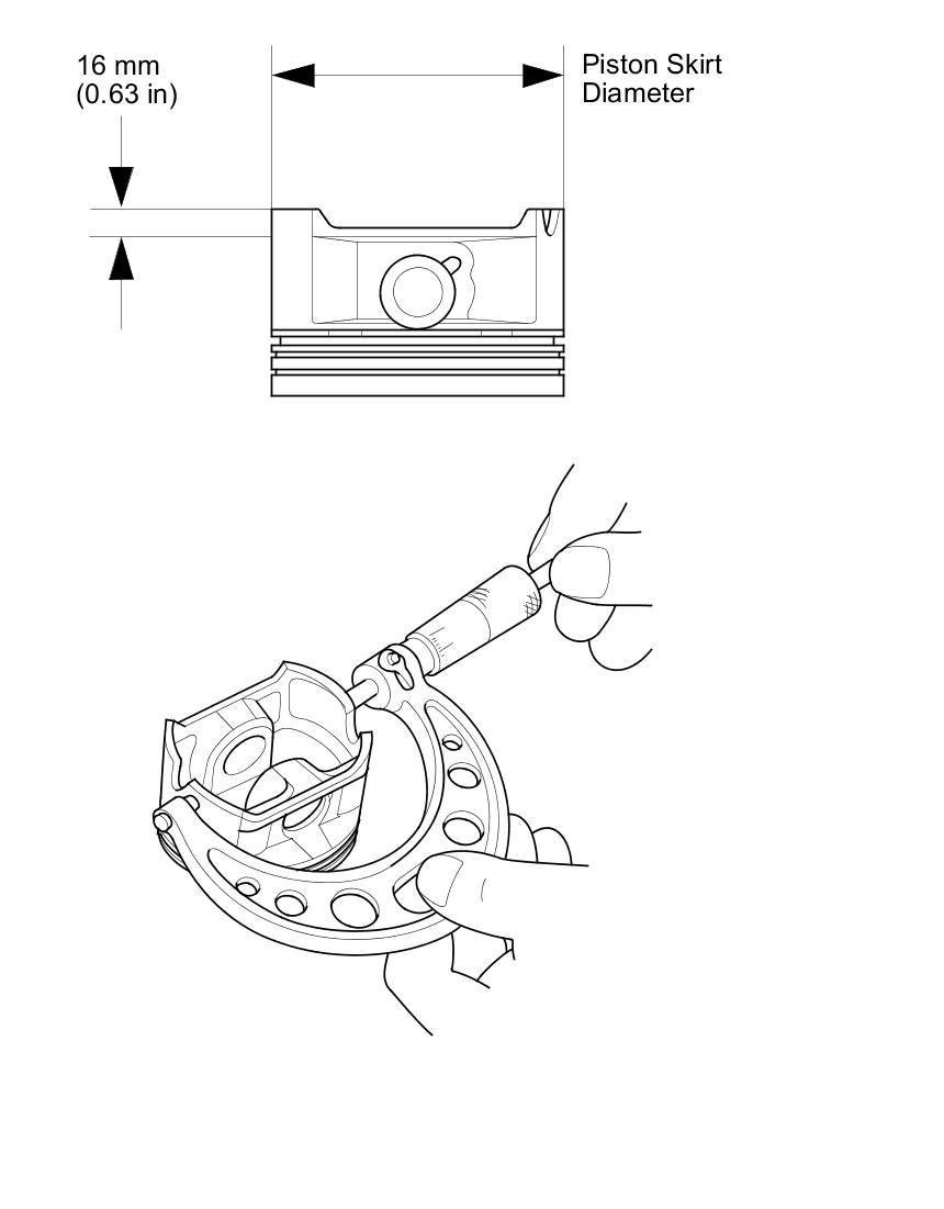 3. Measure the piston skirt diameter at a point 16 mm (0.63 in) from the bottom of the skirt.